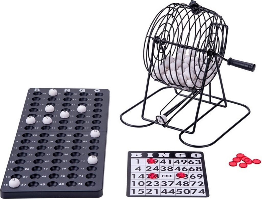 Metalen bingomolen met 75 kunststof ballen. een controlebord. 150 fiches en 18 herbruikbare bingokaarten. Diameter bingomolen: 13.5 cm. Diameter ballen: 1 cm.