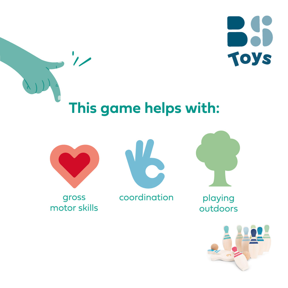 Mooie bowlingset van kurk en hout. Op de achterkant staan cijfers zodat de kleintjes tijdens het bowlen ook nog ongemerkt leren rekenen. Met alle fraaie kleuren staat deze set ook mooi als decoratie op een kinderkamer.