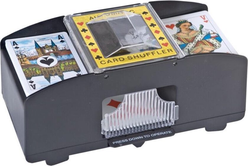 Dankzij deze automatische kaartenschudmachine is schudden met de hand verleden tijd. Dit scheelt moeite, maar voorkomt ook discussie over of de kaarten wel goed geschud zijn! Leg de kaarten op beide zijden van het apparaat, druk op de knop en laat de machine zn gang gaan. De geschudde kaarten komen onderin het bakje te liggen. Let op: de speelkaarten zijn niet inbegrepen. Wordt exclusief 4 AA-batterijen geleverd in full-colour doosje.
