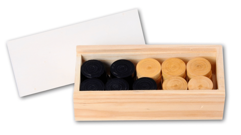 Houten damstenen gemaakt van beukenhout. Er zitten 40 damstenen in de set en ze zijn zwart/naturel van kleur. De damstenen hebben een diameter van 30mm. De stenen zitten opgeborgen in een houten kistje met schuifdeksel.