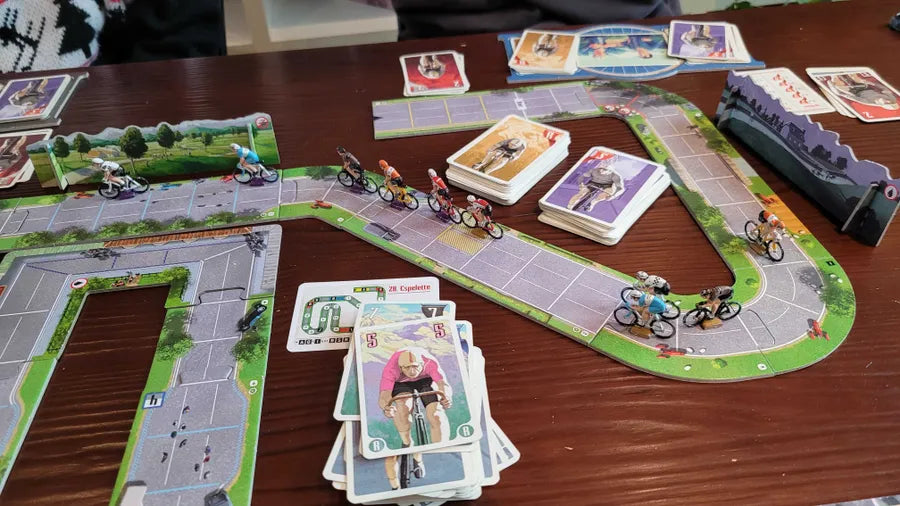 Deze uitbreiding biedt niet alleen een campagnemodus, maar brengt ook nieuwe track tiles, speciale stages en specialistische renners die je de mogelijkheid geven je decks te personaliseren. Of je nu op zoek bent naar een enkele race of een complete campagne, Flamme Rouge: Grand Tour heeft het allemaal.