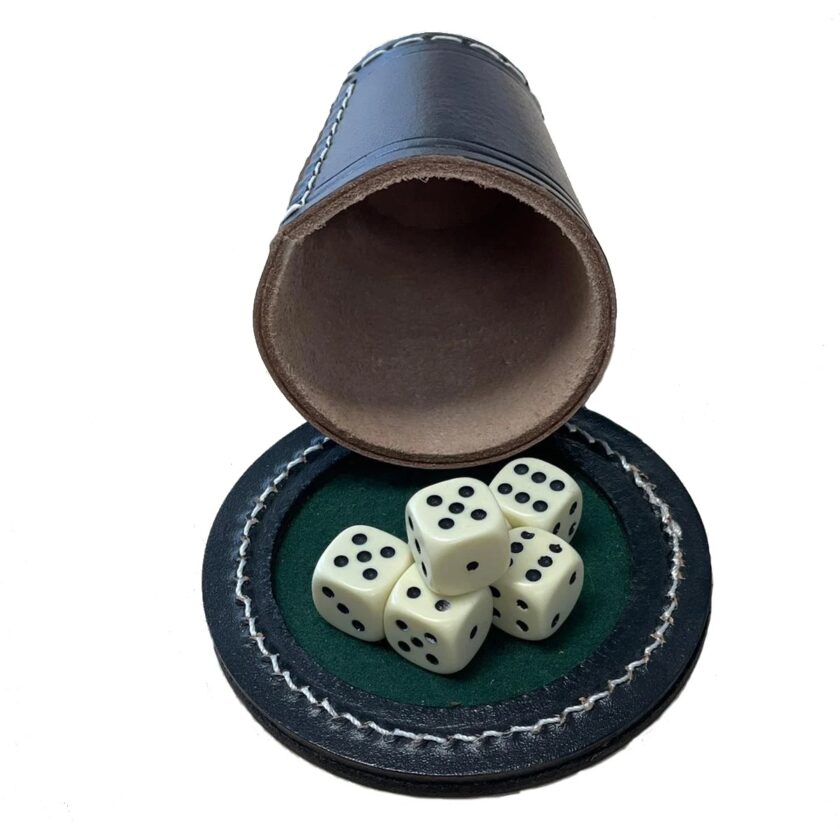 Pokerbeker met Deksel Zwart Leder met Dobbelstenen 16mm (doorsnede 7 cm)
