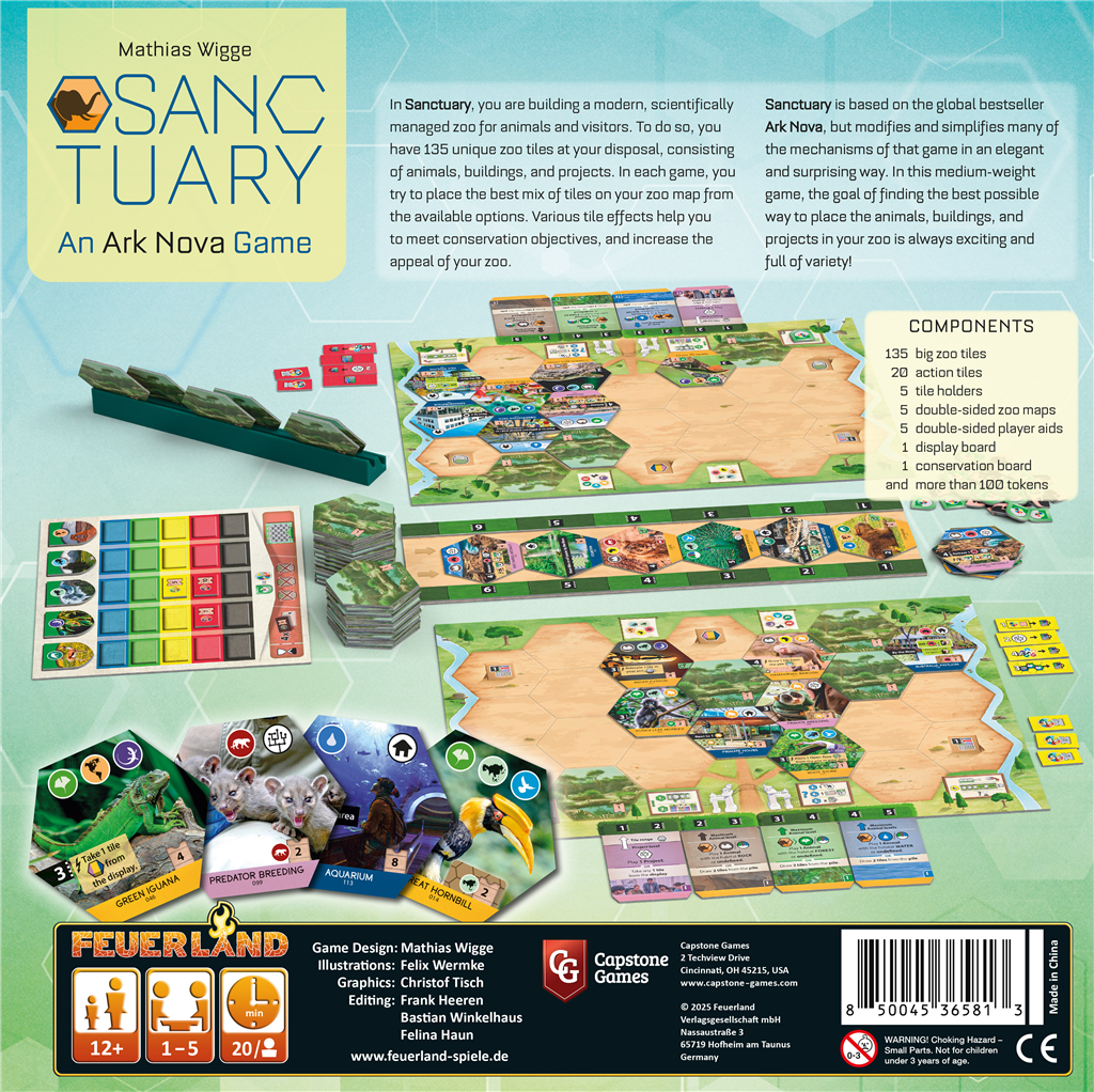 In Sanctuary, you will plan and design a modern, scientifically-managed zoo for animals and visitors. A supply of 135 unique zoo tiles provides you with animals, buildings, and projects. In every game, you want to find the best mix from those available to build the most successful zoological establishment. Different effects on the tiles will help you to achieve conservation goals and to increase the attraction of your zoo.