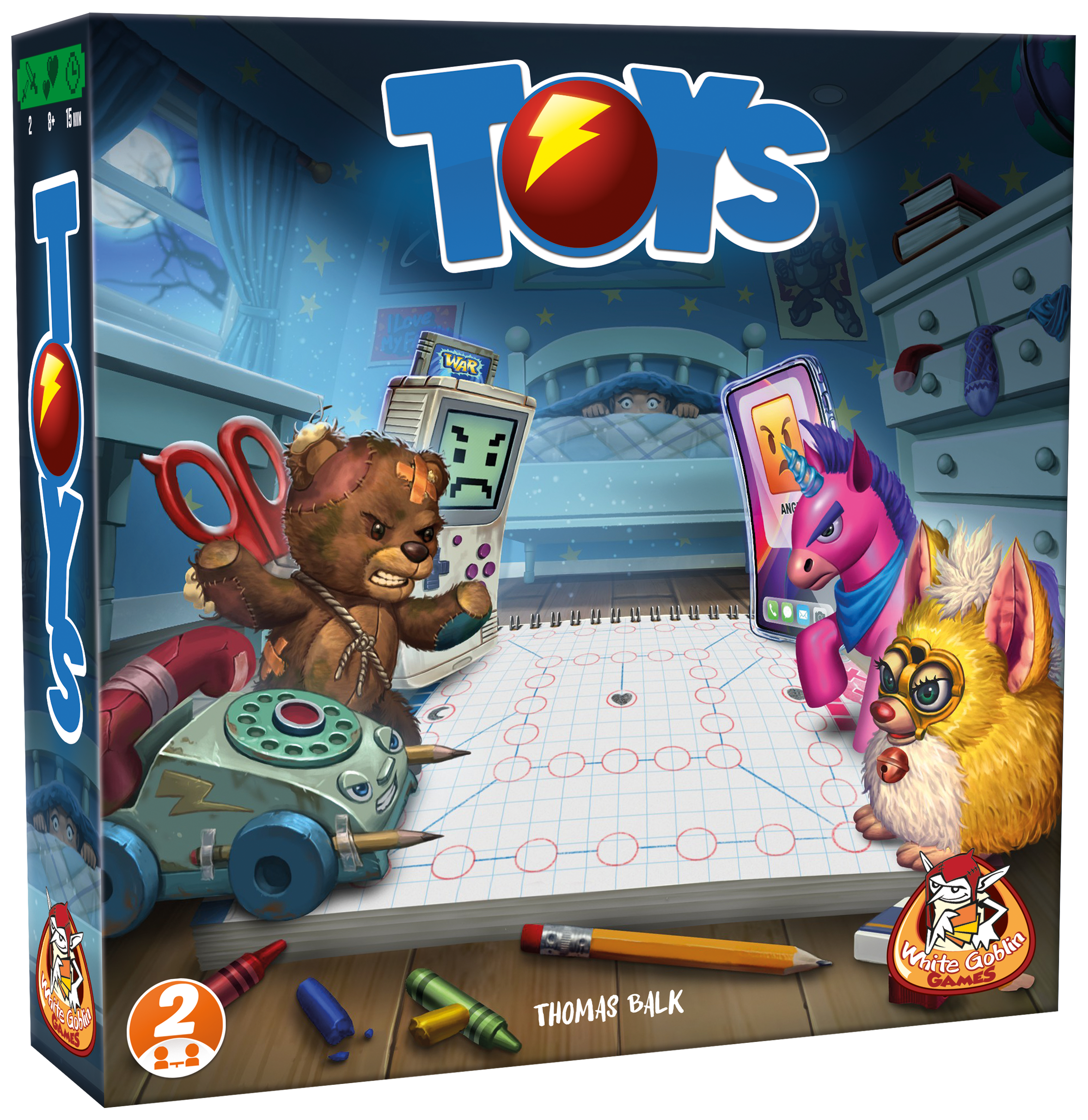 Als de nacht valt, komt het speelgoed tot leven en gaan oud en nieuw speelgoed de strijd met elkaar aan. In Toys probeer je het overwinningsveld van je tegenstander te veroveren door er 1 van jouw speelstukken op te zetten. Dit kun je doen door de speelstukken van je tegenstander uit te schakelen, op een slimme manier te verplaatsen en kaarten tactisch te spelen.