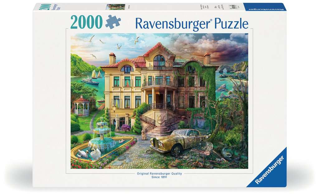 Wat vandaag mooi en nieuw is, zal door tijd en verwaarlozing worden weggevaagd in onze puzzel "Cove Manor Echoes"!Cove Manor was ooit een prachtig toevluchtsoord, maar de tand des tijds heeft het bijna onherkenbaar gemaakt! Welke boodschap wordt er met deze illustratie van 'toen en nu' uitgedrukt? Is het onvermijdelijk dat niets eeuwig duurt of blijven de echoes van een vervlogen tijdperk achter? Of herinnert deze intrigerende scène ons eraan dat alles en iedereen zorg en aandacht nodig heeft om te kunnen bloeien? Waarom zou u vandaag niet eens voor uzelf zorgen door wat tijd te besteden aan het puzzelen met 'Cove Manor Echoes' en de stress van de dag achter u te laten?Deze puzzel van 2000 stukjes combineert prachtige afbeeldingen met strakke stukjes en de perfecte pasvorm van Ravensburger voor een uiterst plezierige puzzelervaring! Onze puzzels zijn gemaakt met een exclusieve, extra dikke kartonnen achterkant en ons superieure papier met linnenstructuur, zodat de afgedrukte afbeelding levendig, scherp en niet reflecterend is. Creëer onvergetelijke momenten met de premium puzzels van Ravensburger!Over de kunstenaar: Eduard studeerde grafisch ontwerp aan de Kharkiv Academy of Arts in Oekraïne. Hij verhuisde in 2014 uit de stad Donetsk en woont nu in Poltava. Eduard haalde zijn inspiratie uit zijn favoriete kunstenaar Albrecht Dürer en maakte illustraties voor tal van tijdschriften. Later stapte hij over naar het ontwerpen van computerspellen en trad hij toe tot Artbeat Studio, een collectief van getalenteerde en succesvolle kunstenaars.Leuk voor iedereen vanaf 14 jaar! Afmetingen: ongeveer 98 x 75 cm wanneer voltooid.