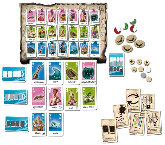 A gameboard, island marker, various tokens, and special cards help players keep track of the game and offer opportunities to influence the course of the missions.