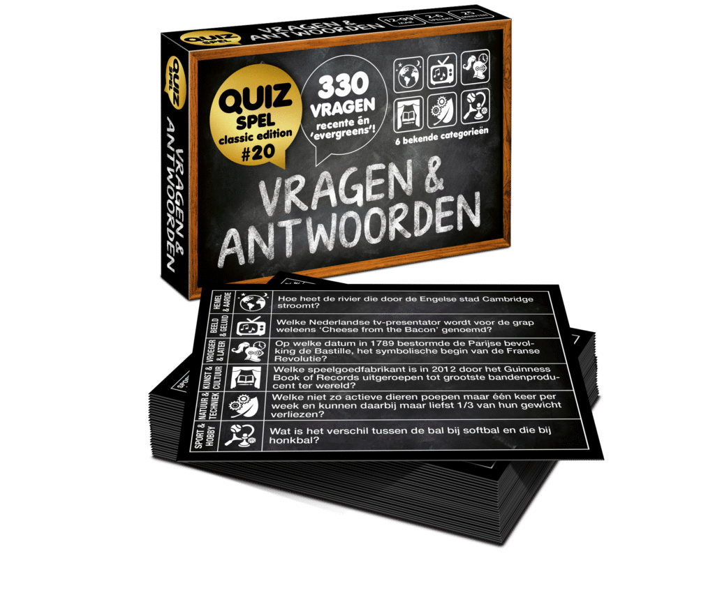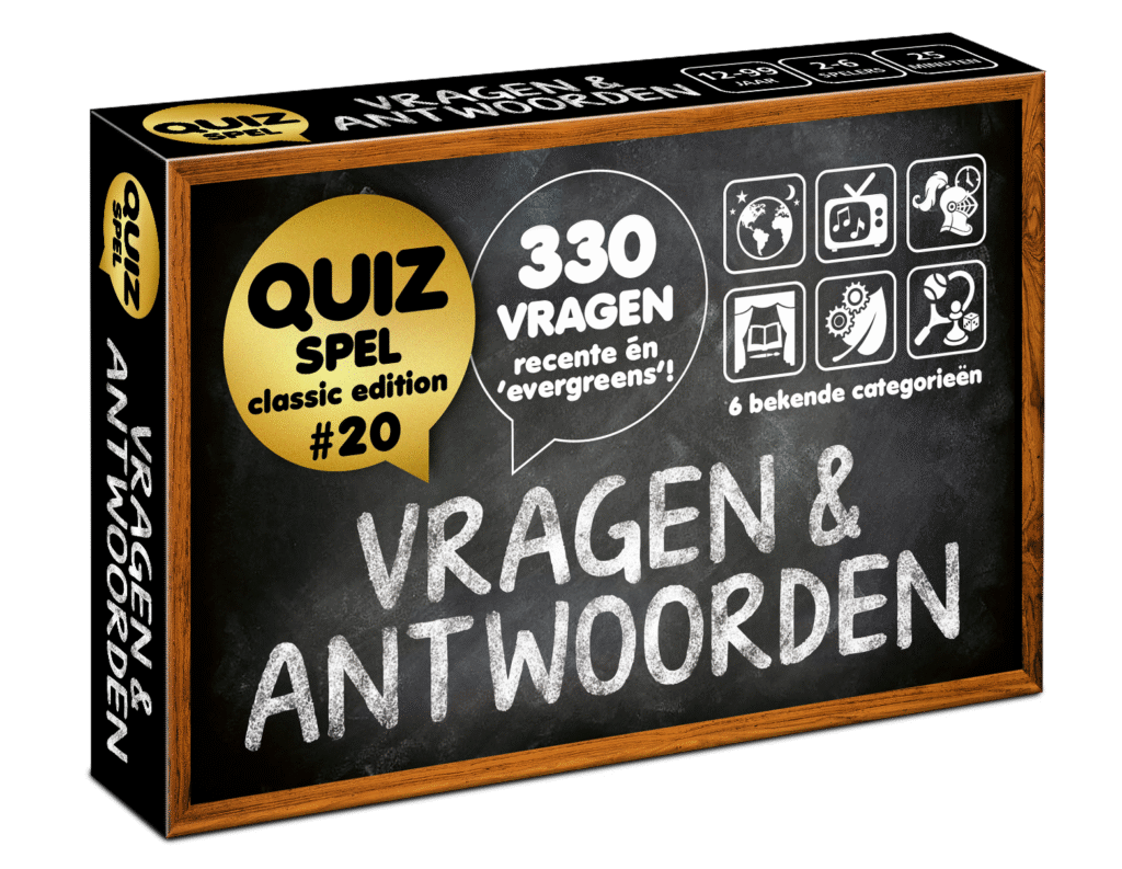 Het pocketformaat quizspel / triviaspel Vragen & Antwoorden – Classic Edition #20 (*** 2025 editie ***) past in iedere broekzak (9,0 × 6,0 × 1,9 cm dus brievenbuspost) en test je kennis met maar liefst 330 gloednieuwe Nederlandse quizvragen - waarvan een groot deel over 2025, aangevuld met tijdloze klassiekers - gemaakt door Marian van Eupen; dé quizvragenmaker van Nederland! Dit compacte, leerzame en vooral gezellige vragenspel maakt van elk moment een quizmoment voor 2-6 spelers van 12-99 jaar! Speel het overal; thuis, op kantoor, in de kroeg, onderweg of zelfs online via videobellen. Met vrienden, familie of collega's. Vragen & Antwoorden #20 is los te spelen maar ook als uitbreiding op editie #1 t/m #19 en andere bekende trivia spellen! Inhoud 330 Nederlandse quizvragen (iedere kaart heeft 6 vragen op de voorkant en de 6 antwoorden op de achterkant) 55 kaarten (1 spelregelkaart + 54 quizkaarten (iedere kaart heeft de 6 bekende categorieën; hemel & aarde, beeld & geluid, vroeger & later, kunst & cultuur, natuur & wetenschap en sport & hobby Highlights Pocketformaat – past in elke broekzak / brievenbuspost 330 Nederlandse quizvragen; grotendeels over 2025, aangevuld met tijdloze klassiekers Simpele regels dus direct beginnen Te gebruiken als zelfstandig quizspel of als uitbreiding bij bekende trivia spellen Geschikt voor 2-6 spelers van 12-99 jaar Pocketformaat → past in je zak en verstuurd als brievenbuspost 'Eco friendly': gemaakt van FSC-karton en verpakt in 100% biologisch afbreekbaar cellofaan Ook leuk voor je eigen pubquiz of tijdens videobellen